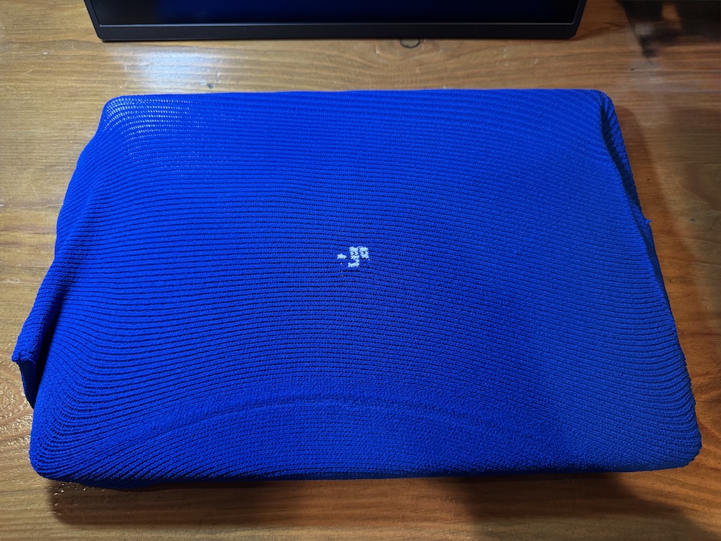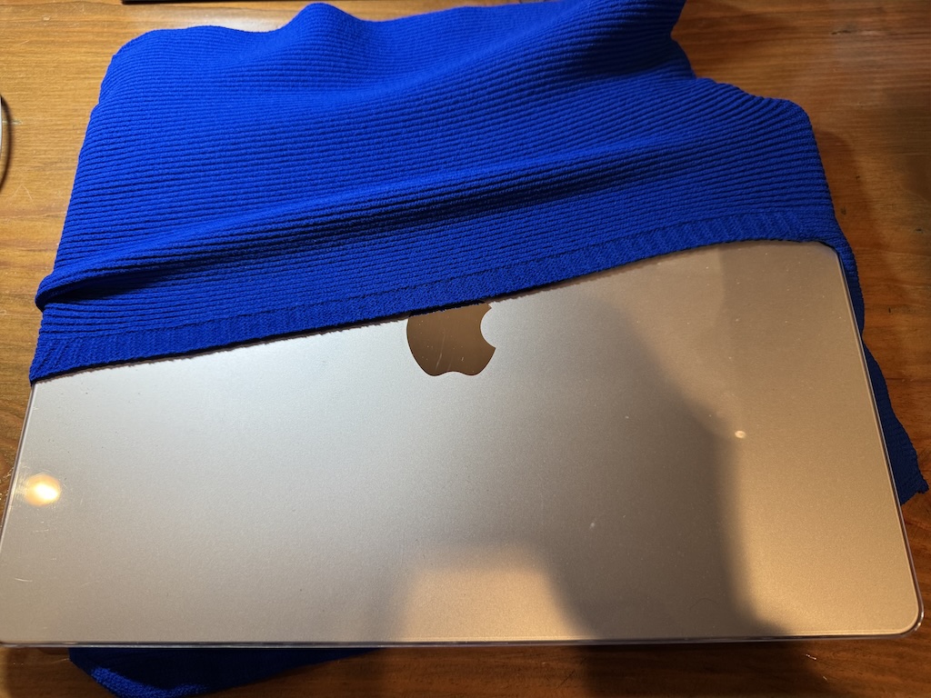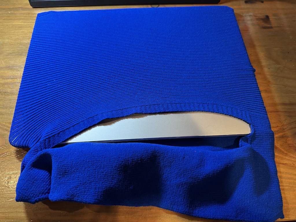 15インチ、16インチMacBookがすっぽり入ります。しかも長辺方向に入ります。生地がパソコン用と比べると薄く感じますが、パソコンを包んでくれますので、傷付き防止になると思います。