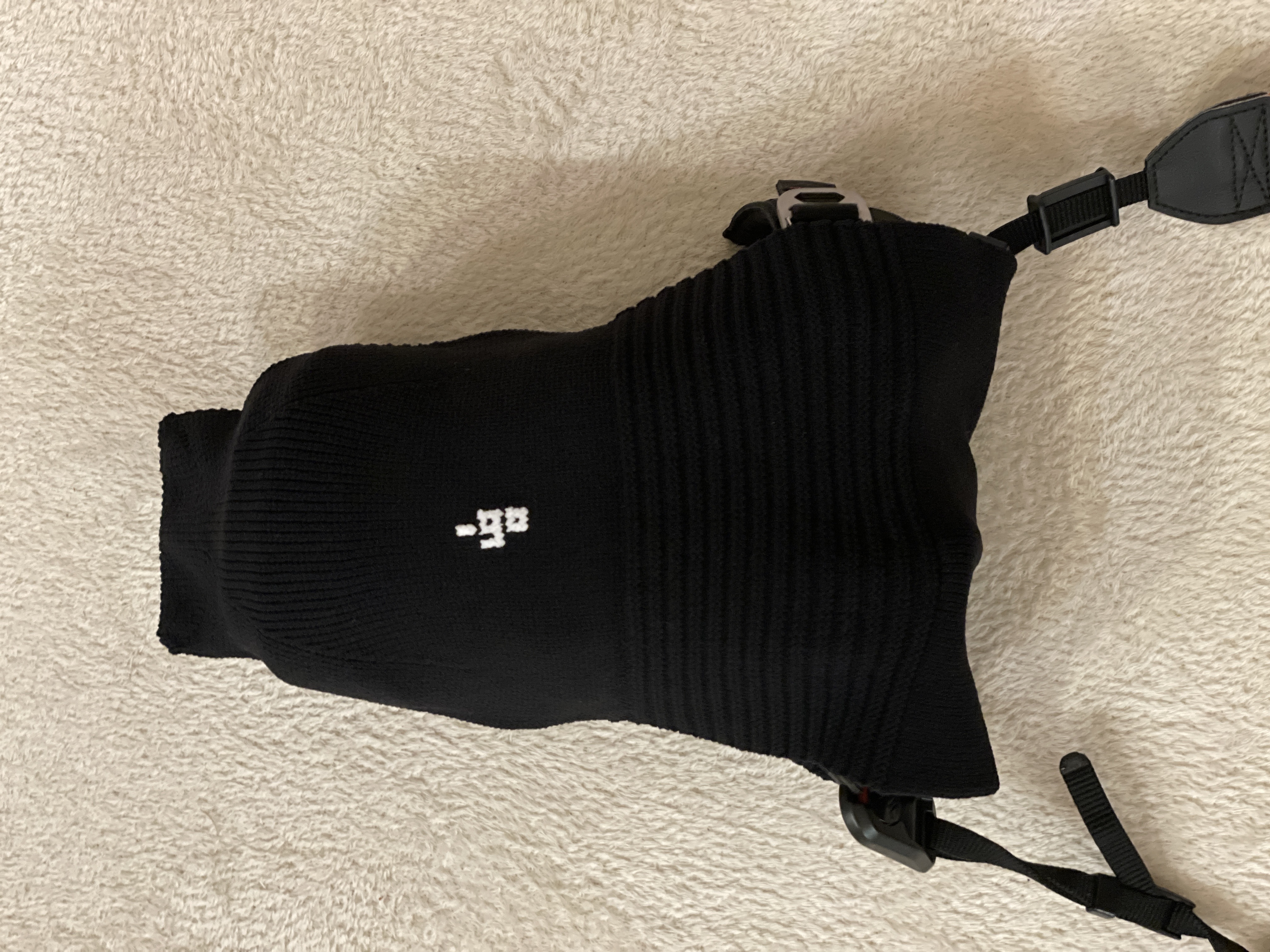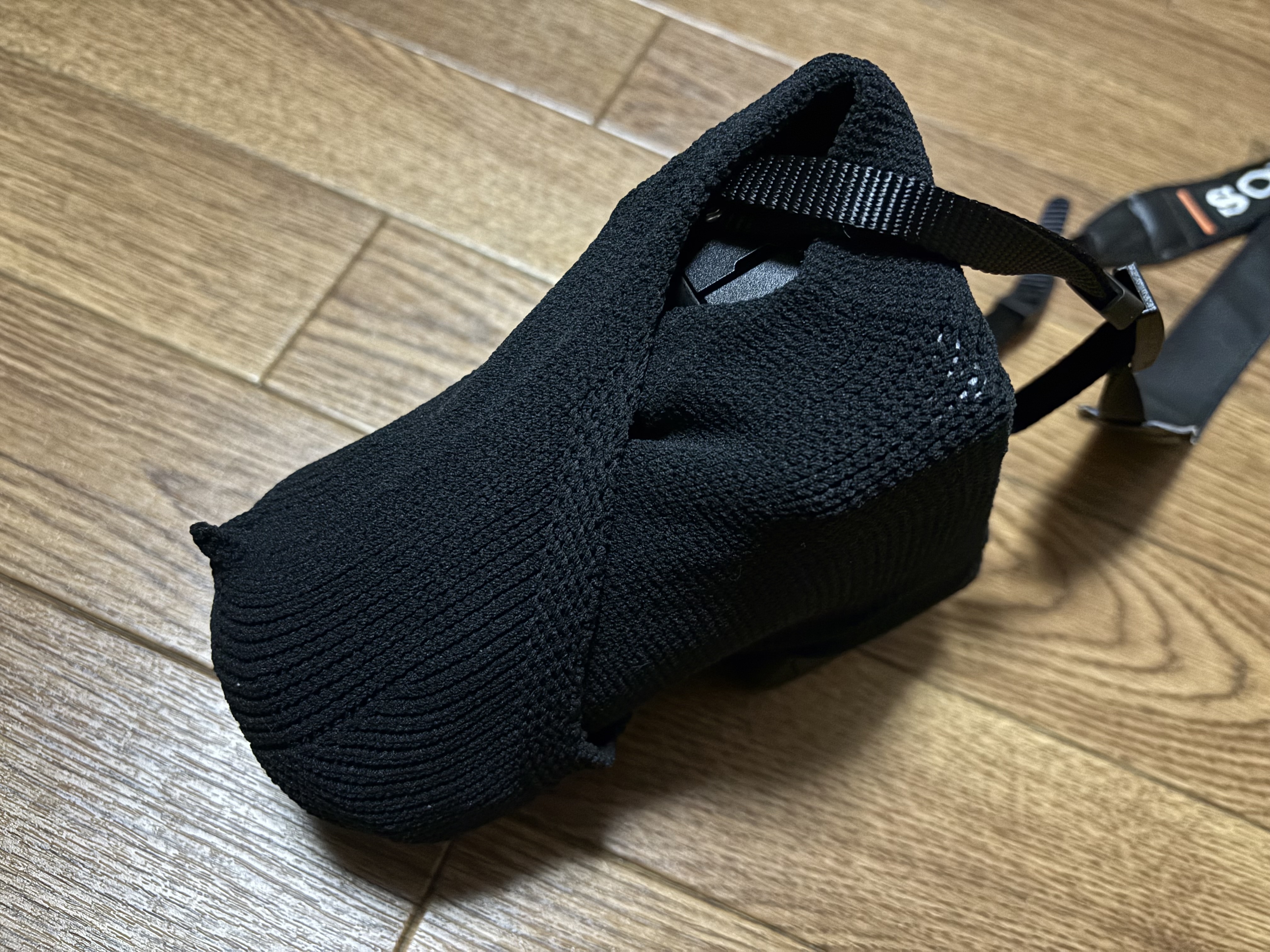 商品が届くまで、ザイズが合うか少し心配でしたが、レンズを付けたままくるっと包むと、最初のレンズ側に少し余裕が有るものの丁度良い感じに包んでくれました。