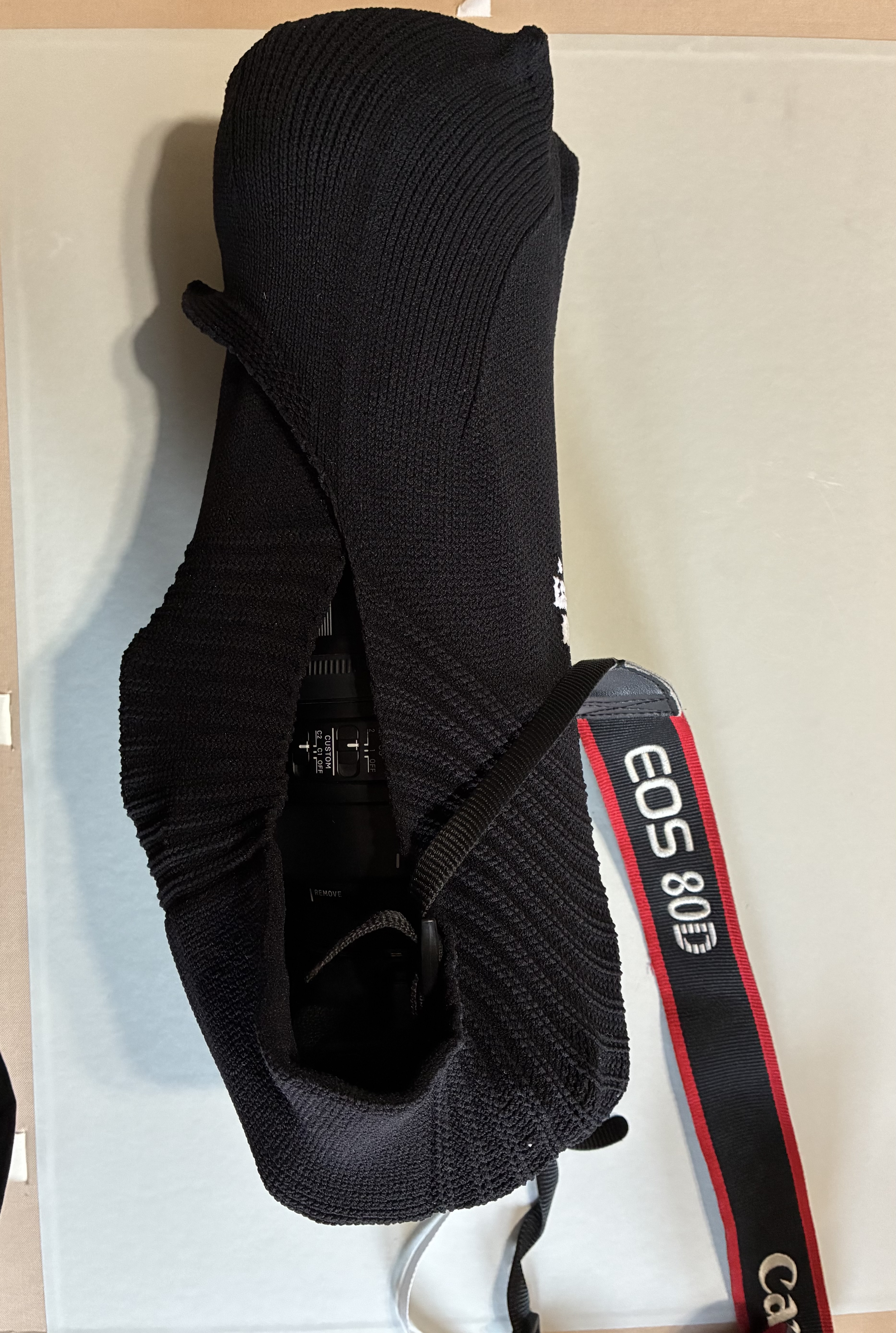 ストロボのコネクタ部分にひっかけてしまい、内側は少し糸がつれちゃっていますが、穴が空いているわけではないので、使用にはなんの問題もなく、安心感も込みでいいアイテムです。