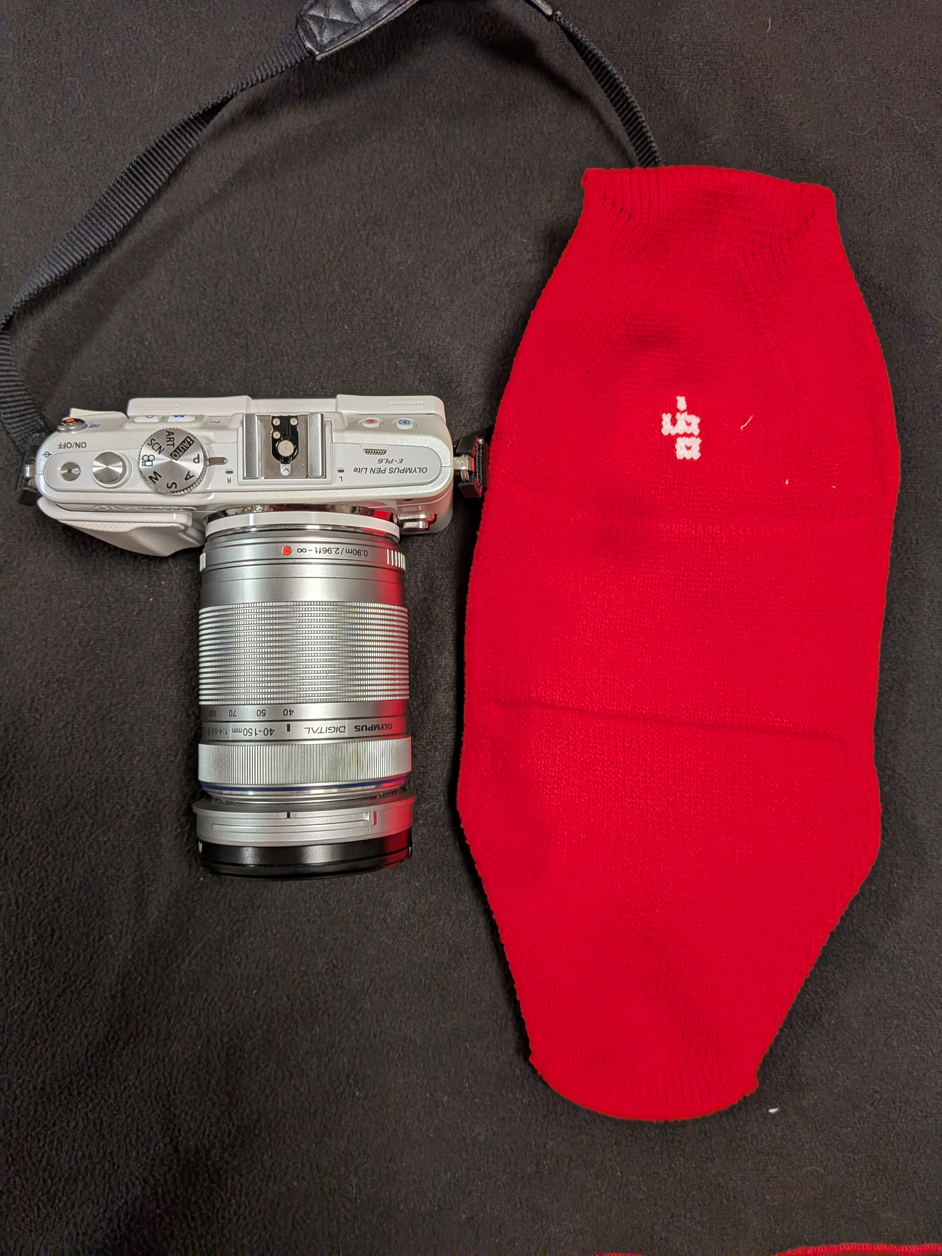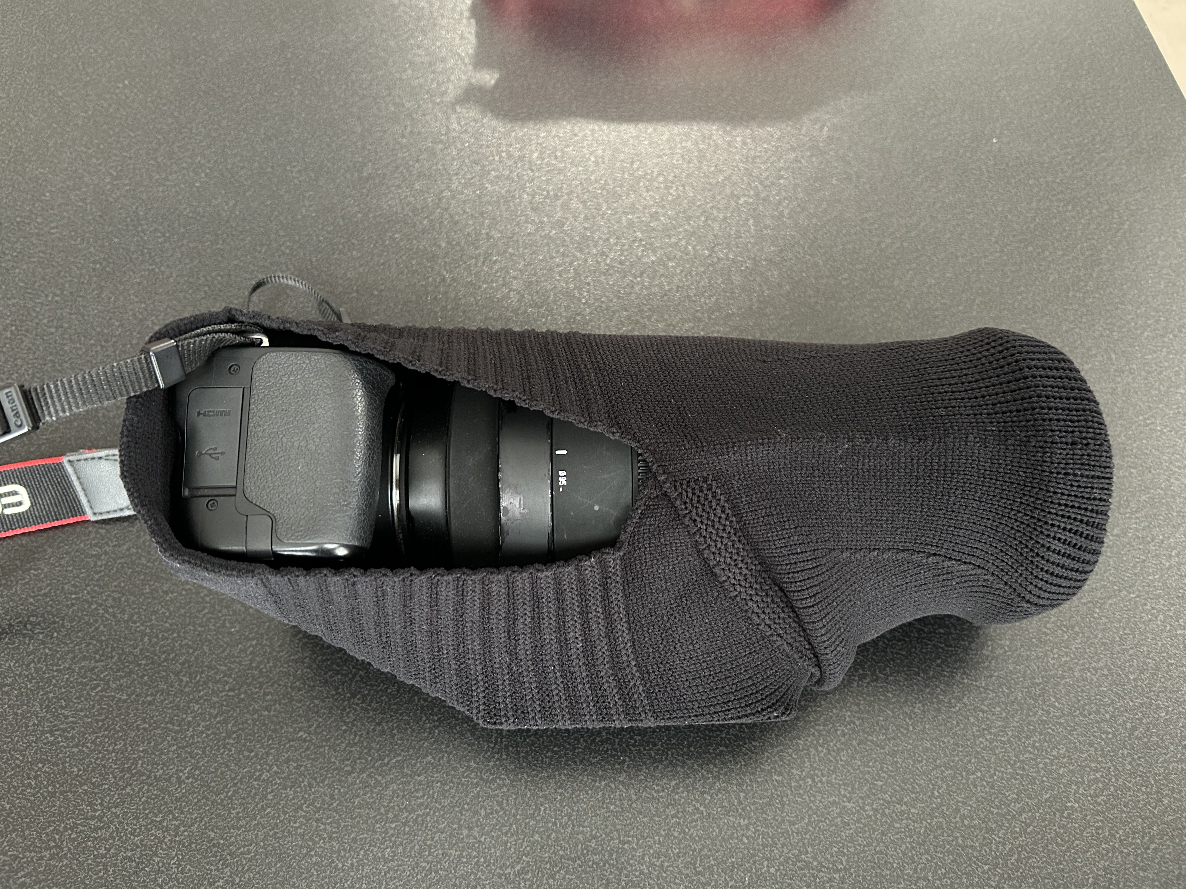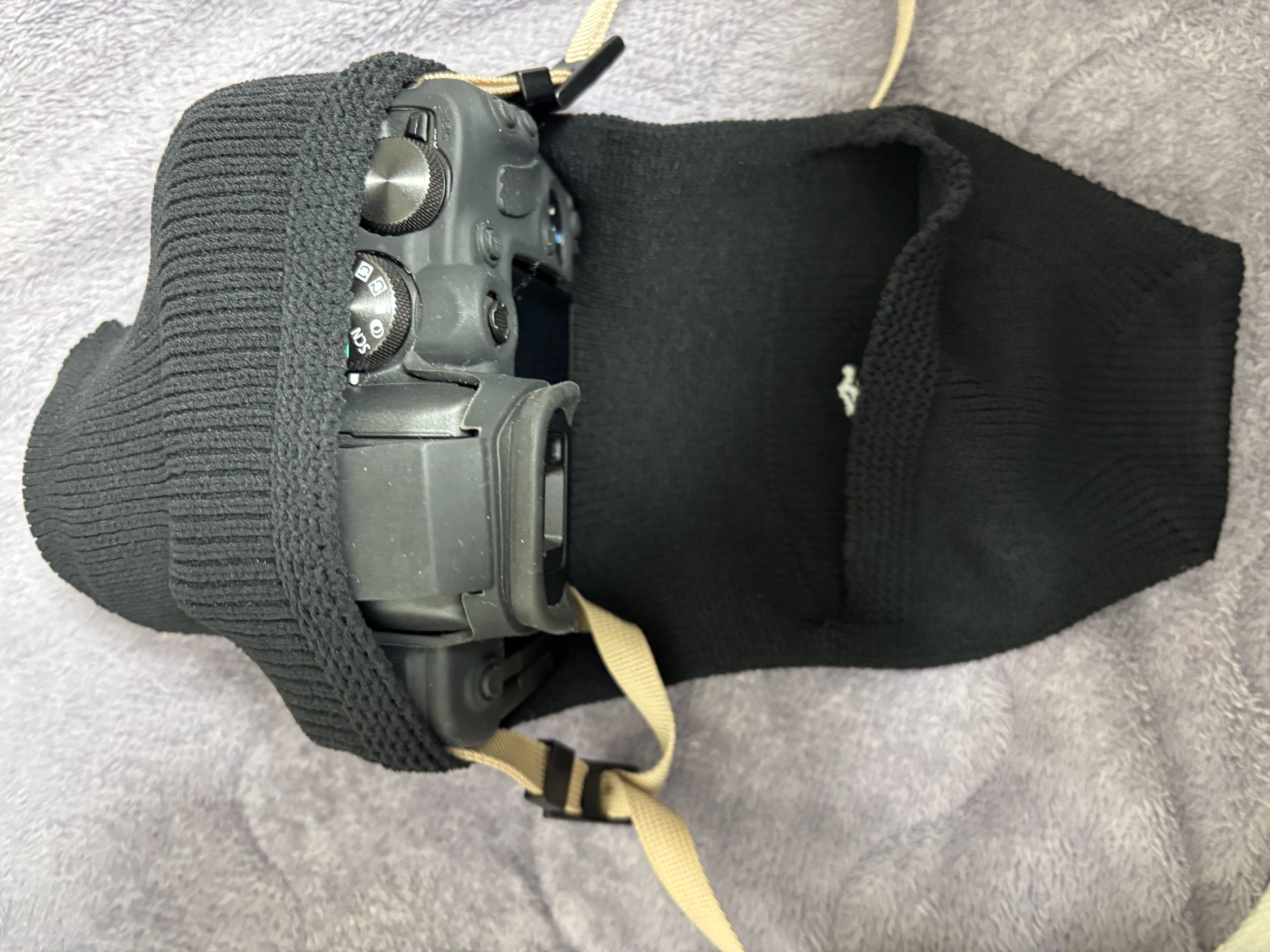 カメラに薄手のシリコンカバーをした状態で包んでいます。ダボっとした感じはなく、ぴったりなサイズ感でした。