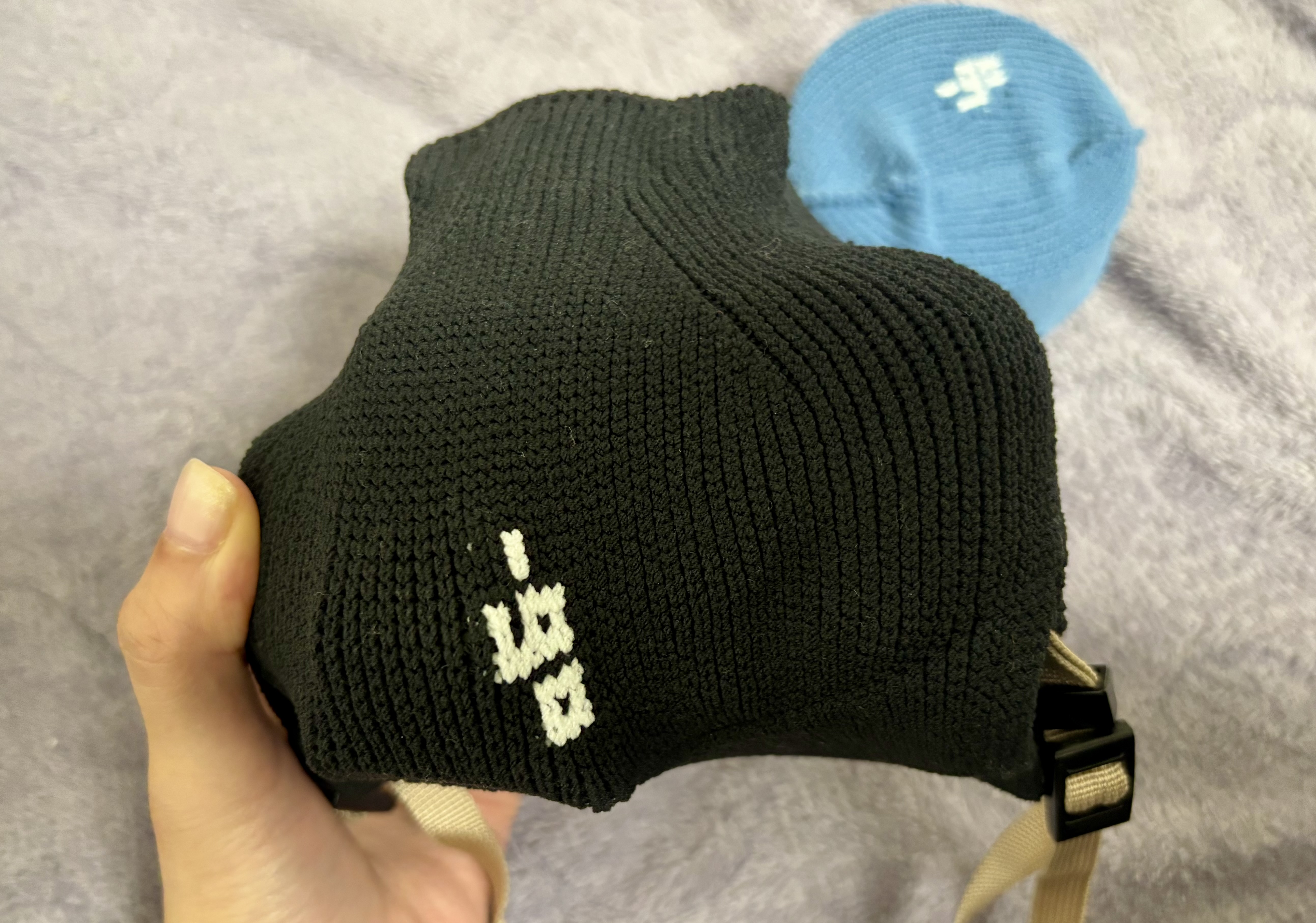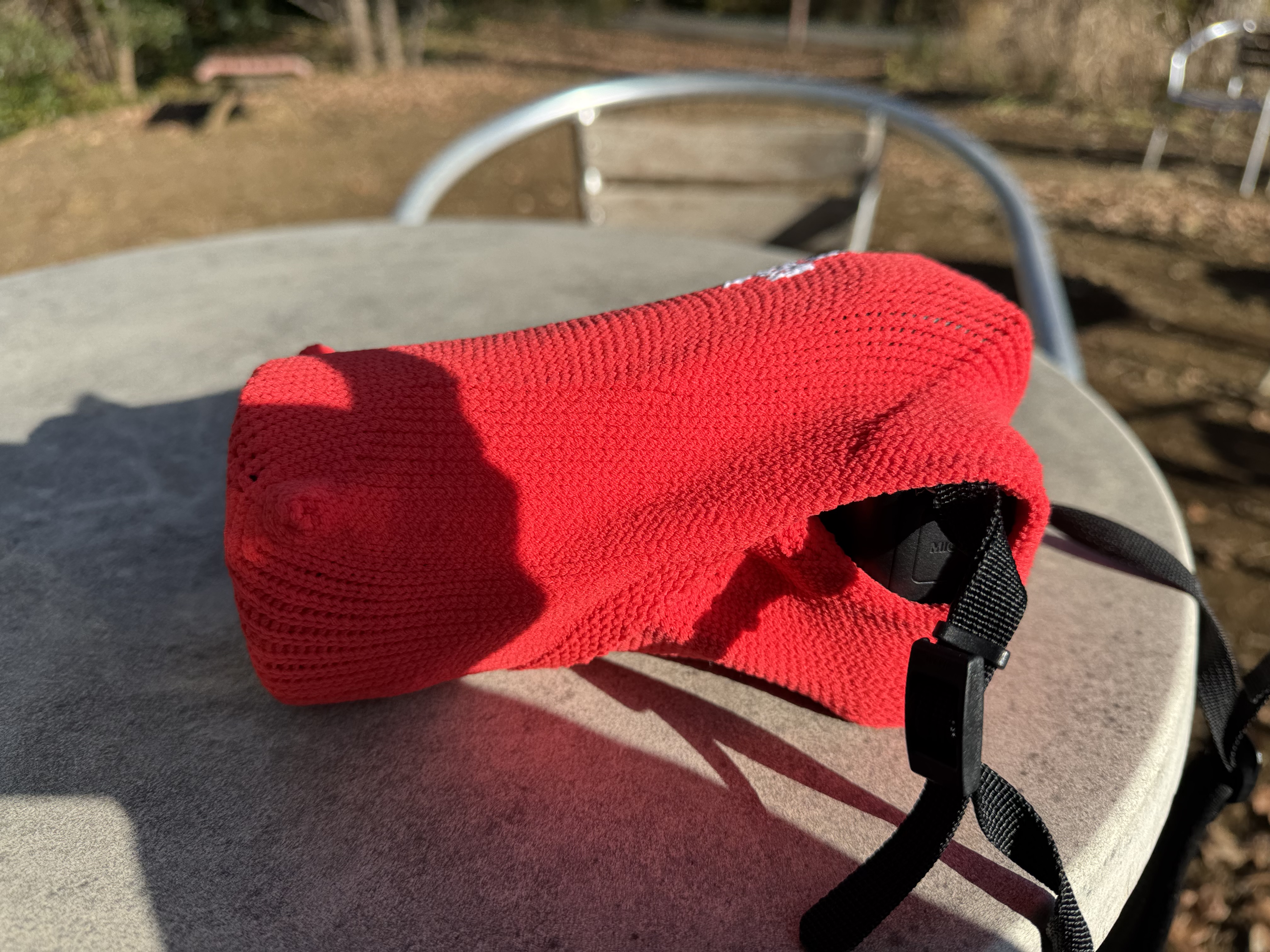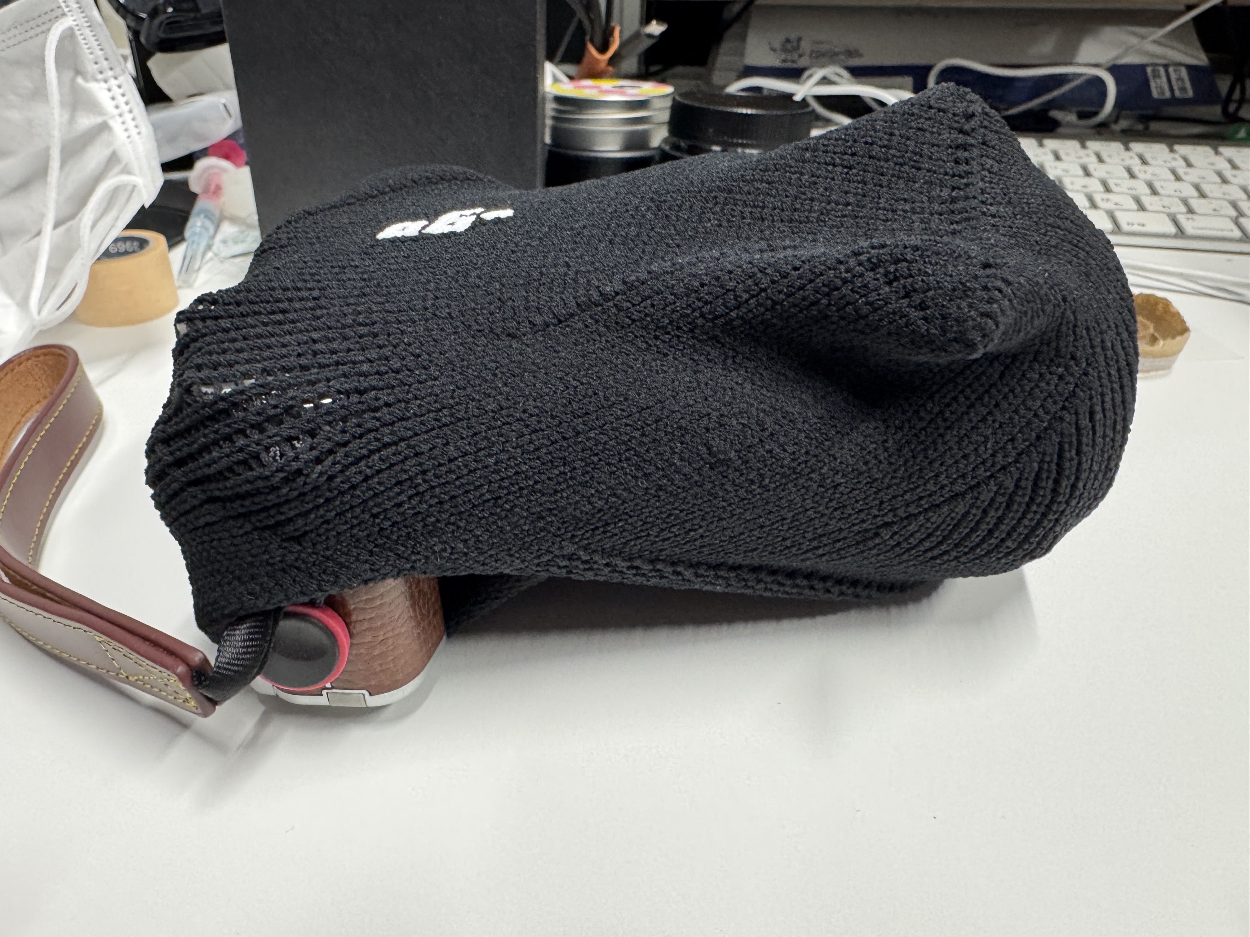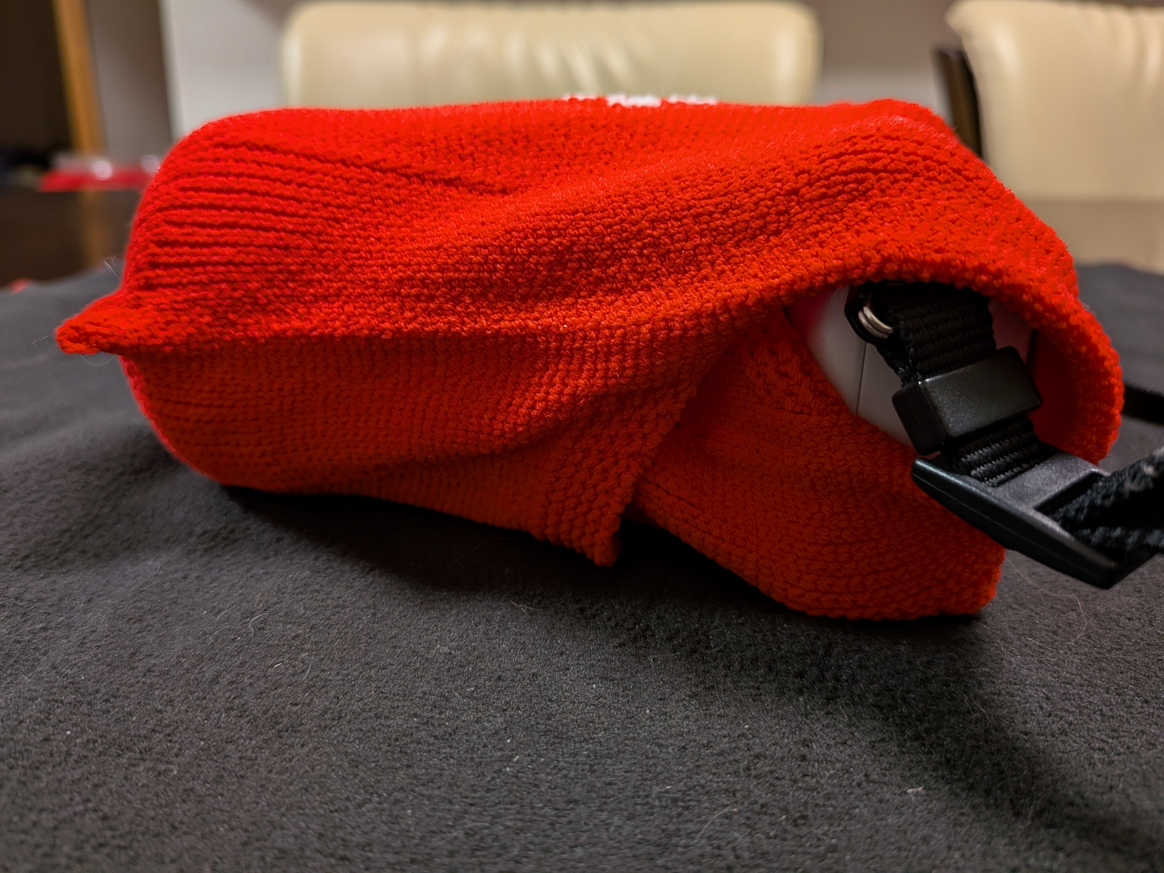 カメラに薄手のシリコンカバーをした状態で包んでいます。ダボっとした感じはなく、ぴったりなサイズ感でした。
