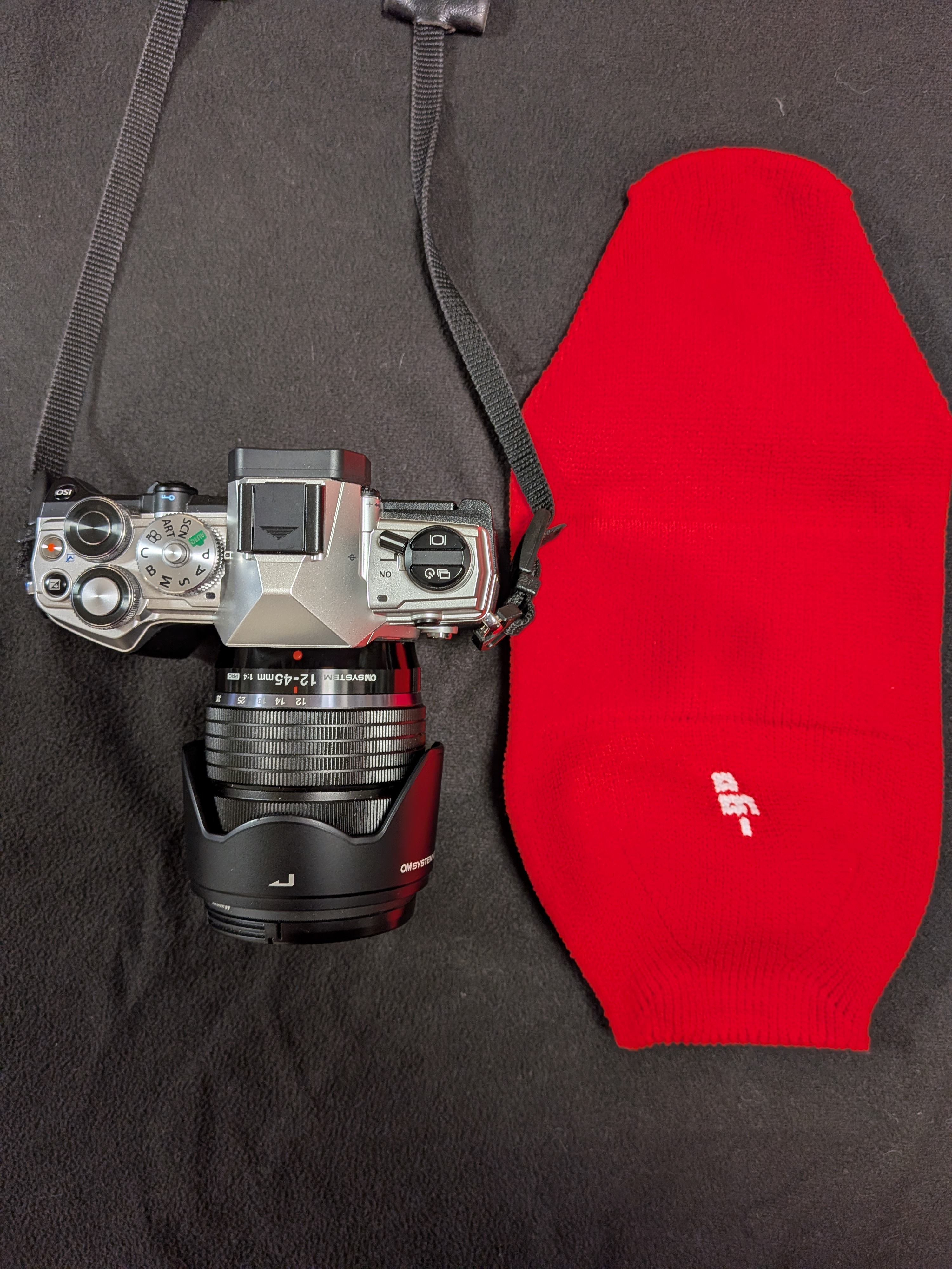 Mだとあまり伸ばさなくても入りますが、Sはおもいっきり伸ばしてジャストサイズという感じです。ただ、ホットシューカバーをつけないとホットシューの角が引っかかります。