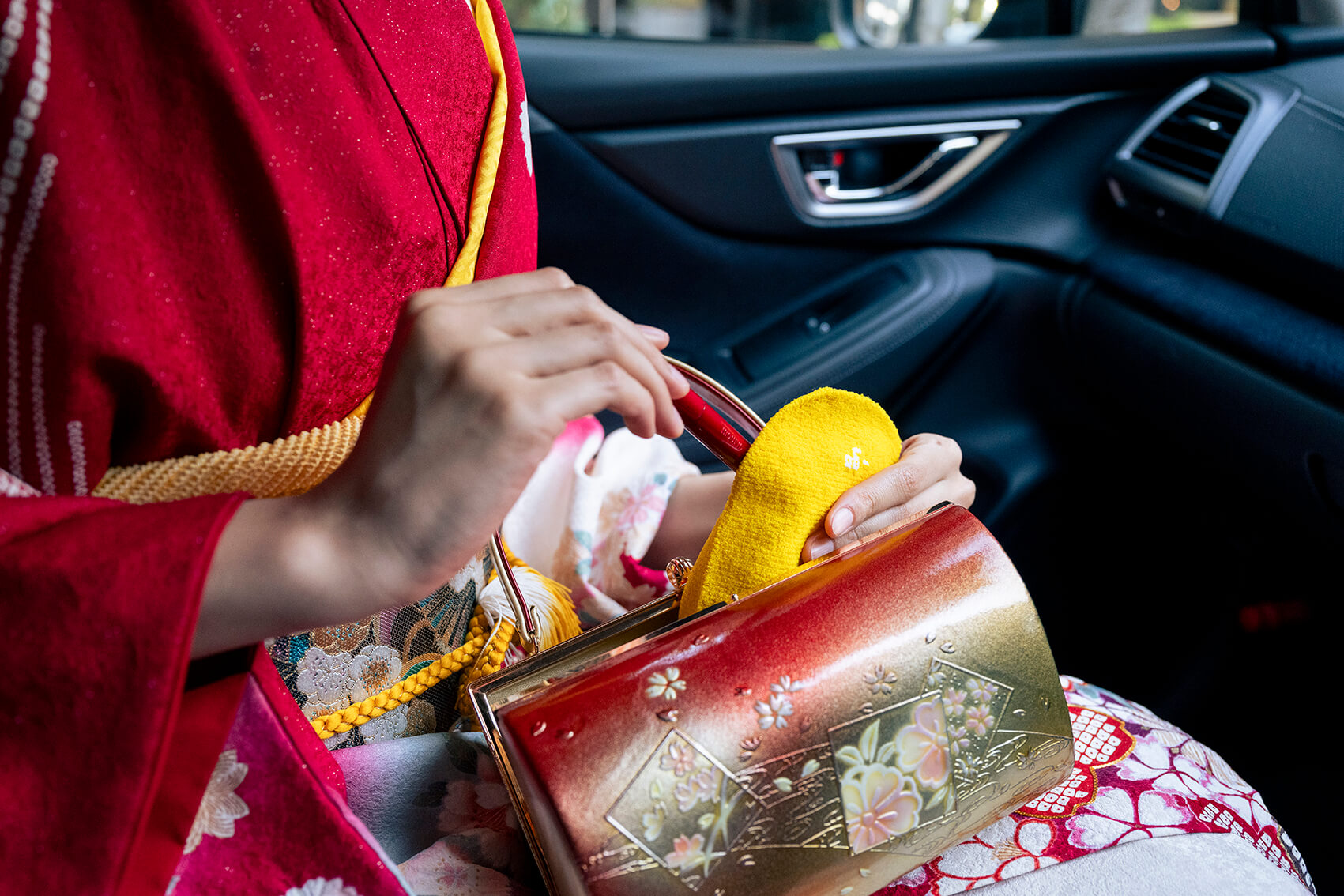 口紅やコンパクト、くしなど、出先で使いたいメイク用品を_go ovalに入れて持ち歩いています。成人式の日は赤い着物に合わせて_go oval イエローをチョイス。カラフルに優しくぴったりと包み込んでくれる_goで、レンタルした小さな着物用バッグの内側を汚す心配もなく、安心して持ち運べました。