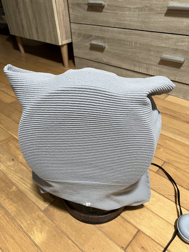 パッキングとしてすぐに思いついたのは旅行用の着替えを入れることだったのですが、あんまりコンパクトにはならなかったので、包み隠すというよりは守れるもの、と考えて扇風機カバーにしました。ヘッド部分がちょうど収まりホコリや衝撃から守られて良い感じです。