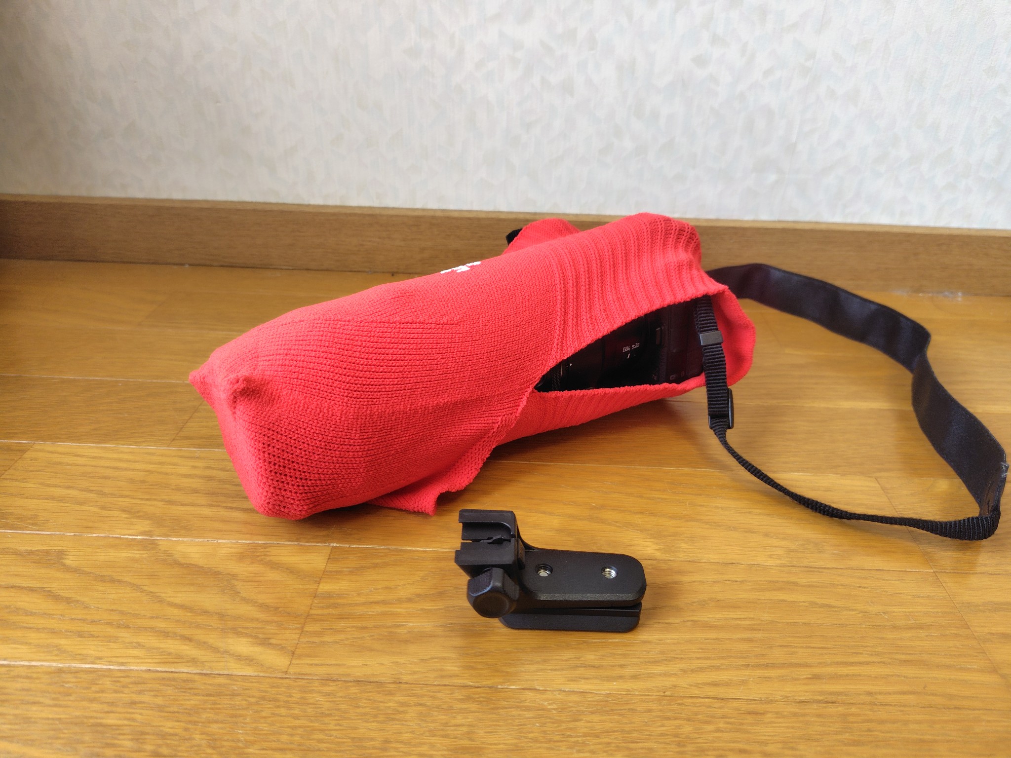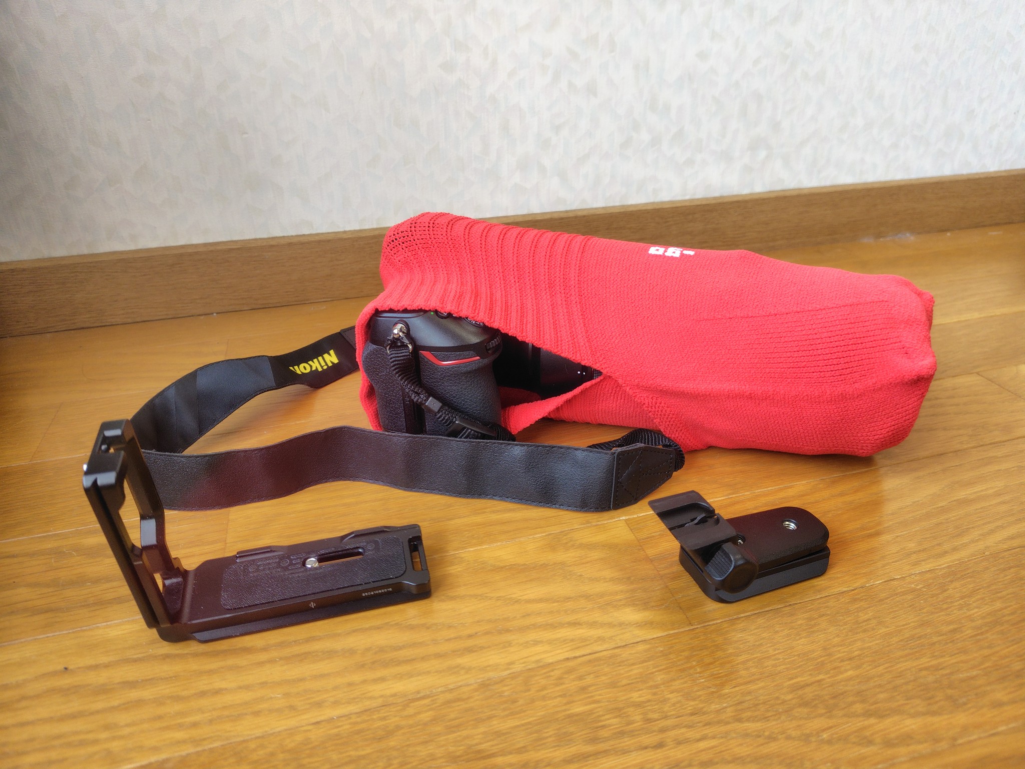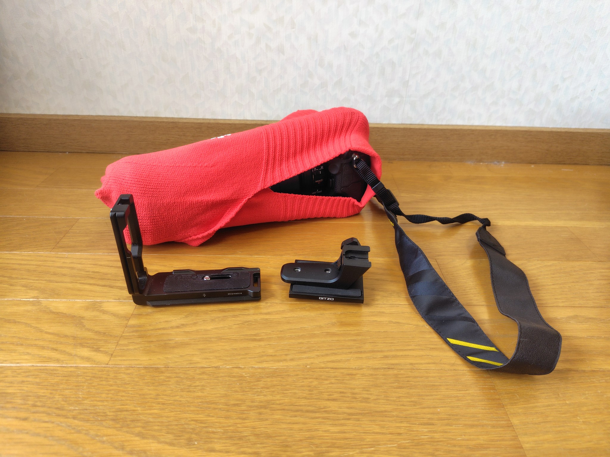 愛機のZ8とNIKKOR Z70-200mmf2.8及びZ100-400mmを包んでみました。その際、ズームレンズの三脚座とカメラ用L字クランプは外しました。