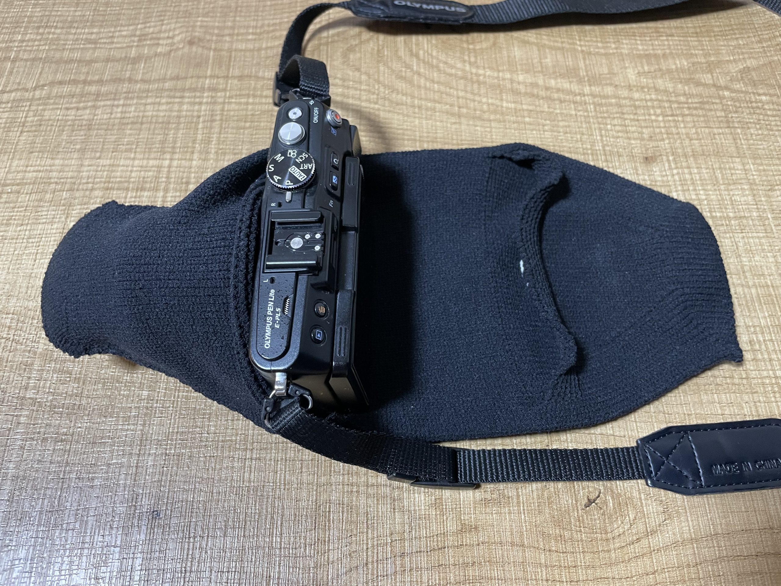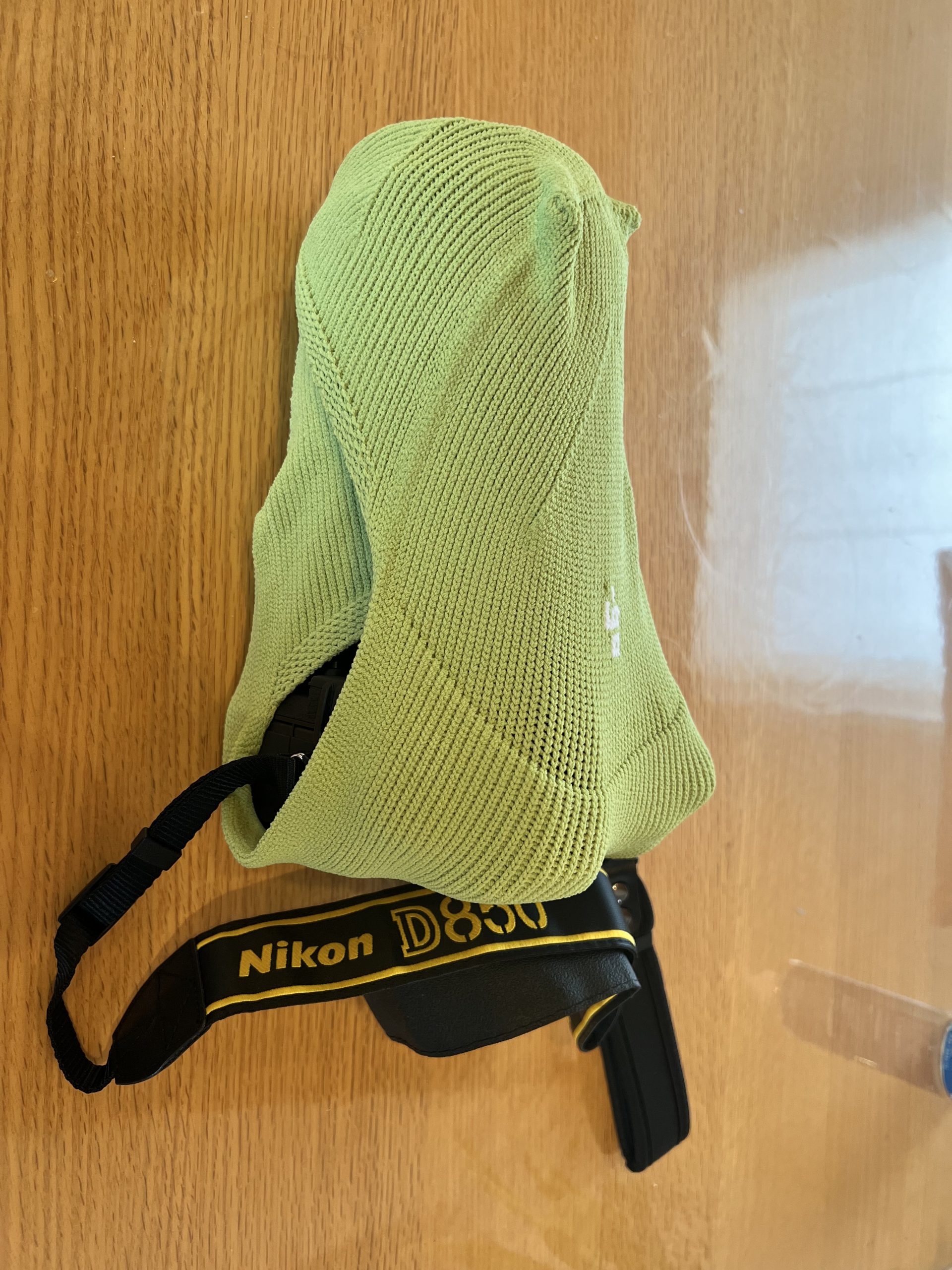 ニットが伸びて少し隙間ができて中のカメラが微妙に見えるようにはなりますが、移動中にさっとカバーしたい時などには問題ない程度だと思います。