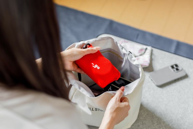 360°どの方向にも伸びるニット素材の収納ポーチ「パッキングニット_go」